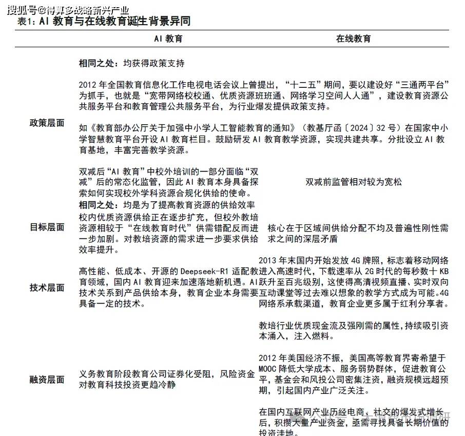 AI 教育與在線教育誕生于相似但不完全相同的土壤。1)政策層面,“AI 教育”與在線教育同樣獲得政策支持,但“A1教育”中校外培訓(xùn)的一部分面臨“雙減”后的常態(tài)化監(jiān)管,因此 A1教育本身具備探索如何實(shí)現(xiàn)校外學(xué)科資源合規(guī)化供給的使命。2)目標(biāo)層面:在線教育主要是通過(guò)網(wǎng)絡(luò)改善下沉市場(chǎng)優(yōu)質(zhì)供給稀缺的問(wèn)題,而“雙減”后大量教培機(jī)構(gòu)出清,總量上的供需錯(cuò)配要求 AI教育還需提高供給效率。3)技術(shù)層面:二者都為技術(shù)驅(qū)動(dòng),但在線教育發(fā)展過(guò)程中,教育企業(yè)更多是技術(shù)紅利分享者,直播課堂等技術(shù)門檻相對(duì)不高。而 AI直接驅(qū)動(dòng)教學(xué)產(chǎn)品供給變化,目前對(duì)教育企業(yè)而言仍有一定的技術(shù)門檻。4)融資層面:“雙減”后義務(wù)教育學(xué)科類資產(chǎn)的證券化路徑受限,國(guó)內(nèi)教育科技 VC 投資迅速收縮。對(duì)于A1教育而言,一方面助推的資本規(guī)模縮小,相關(guān)的商業(yè)化路徑推進(jìn)周期或?qū)⒗L(zhǎng),但另一方面也意味著存量玩家有望保持競(jìng)爭(zhēng)優(yōu)勢(shì),以教育產(chǎn)業(yè)資金主導(dǎo)的 AI教育也有望更加聚焦提升產(chǎn)品質(zhì)量、聚焦教育本身。具體來(lái)看: