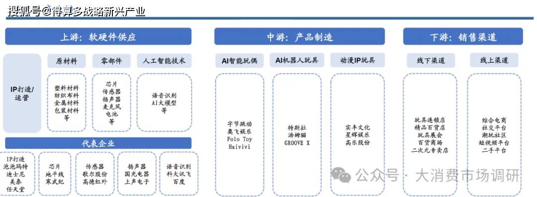 AI玩具產(chǎn)業(yè)鏈日趨成熟。AI玩具產(chǎn)業(yè)鏈上游為IP運(yùn)營及軟硬件供應(yīng),硬件包括芯片、傳感器、揚(yáng)聲器、麥克風(fēng)、電池等,軟件包括語音識(shí)別、AI大模型等;中游為AI玩具產(chǎn)品的設(shè)計(jì)和制造,主要包括AI機(jī)器人玩具、AI毛絨玩具、AI動(dòng)漫IP玩具、AI掛件玩具等;下游為產(chǎn)品的銷售環(huán)節(jié),包含線下零售渠道和線上電商平臺(tái)等。