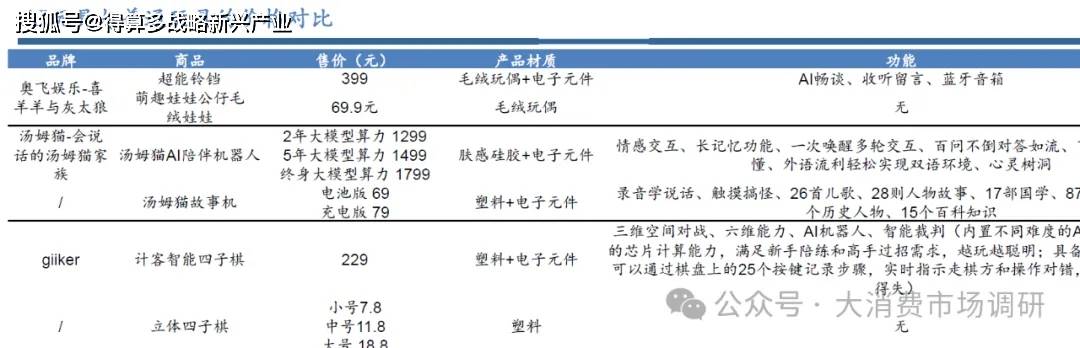 價(jià):AI玩具定價(jià)為普通玩具幾倍到幾十倍不等。將同尺寸同類型的AI玩具與普通玩具進(jìn)行對比,普通玩具的價(jià)格在百元以內(nèi),AI玩具的價(jià)格通常在幾百元甚至千元不等,相較于普通玩偶,AI玩具的定價(jià)提升幅度約在幾倍到幾十倍不等,提升幅度較大。以喜羊羊與灰太狼玩具為例,普通喜羊羊與灰太狼萌趣娃娃公仔毛絨娃娃價(jià)格為69.9元,而喜羊羊智能鈴鐺娃娃價(jià)格為399元,為普通玩具價(jià)格5.7倍。以湯姆貓玩具為例,普通湯姆貓故事機(jī)價(jià)格為69元,湯姆貓AI陪伴機(jī)器人價(jià)格為1799元,為普通玩具價(jià)格26.1倍。以四子棋玩具為例,普通四子棋價(jià)格為18.8元,giiker智能四子棋價(jià)格為229元,為普通玩具價(jià)格12.2倍。即使是基礎(chǔ)款A(yù)I玩具,其價(jià)格也達(dá)到了普通毛絨玩具的幾倍,傳統(tǒng)玩具AI化有望提升玩具產(chǎn)品客單價(jià),從而擴(kuò)容玩具市場規(guī)模。