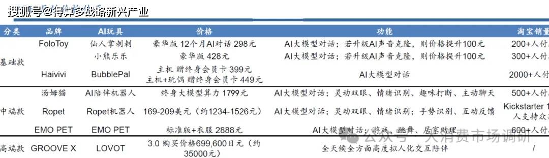 定價(jià)方面,AI玩具定價(jià)較高,且差異較大。AI 玩具的價(jià)格從百元左右的基礎(chǔ)款到數(shù)千元的高端產(chǎn)品均有,價(jià)格體系較為多樣化?;A(chǔ)款 AI 玩具價(jià)格多在 300元左右,主要功能為AI大模型對話,代表產(chǎn)品包括FoloToy的小熊樂樂、Haivivi的BubblePal。中端款A(yù)I玩具價(jià)格多在2000元左右,在AI大模型對話功能的基礎(chǔ)上擁有靈動(dòng)雙眼、情緒識(shí)別等附加功能,代表產(chǎn)品包括Ropet機(jī)器人、EMOPET智能機(jī)器人等。高端 AI 玩具價(jià)格在萬元以上,為具備復(fù)雜編程和高度擬人化交互功能的機(jī)器人,代表產(chǎn)品為GROOVE X的LOVOT。目前,AI玩具的價(jià)格帶差異較大,尤其是基礎(chǔ)款產(chǎn)品與高端產(chǎn)品的價(jià)格差距較大,存在一定價(jià)格斷層。