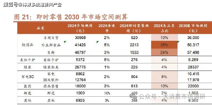 品類維度,即時零售品類供給伴隨閃電倉及品牌門店等新供應鏈模式的引入,從生鮮快消類向全品類拓展。品類維度,即時零售在生鮮、食品飲料、快消等線下商超主要銷售的品類中滲透率較高,而伴隨閃電倉、品牌門店等新模式的引入,3C 數(shù)碼家電、美妝服飾百貨等品類也逐漸進入即時零售賽道,擴大供給范圍、提升行業(yè)規(guī)模,同時如蘋果、華為、名創(chuàng)優(yōu)品等知名品牌也通過加碼即時零售業(yè)態(tài)為品牌開拓新渠道增量。