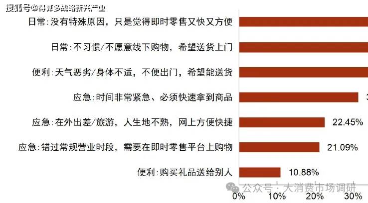 從消費場景來看,基于日?!罢毙枨笏椭磷≌瑓^(qū)的場景占比最高,并逐步呈現(xiàn)多元化發(fā)展。美團研究院數(shù)據(jù)顯示,消費者使用即時零售購物的場景中,排名前二的是消費者日常需求下出于“沒有特殊原因,認為即時零售又快又方便”、“不愿意線下購物希望送貨上門”的原因選擇即時零售,同時從送達地點來看住宅小區(qū)占比超6 成,其次是寫字樓/酒店等商業(yè)化場景,可以看出即時零售更多滿足用戶日常宅家場景的便利消費需求,同時據(jù)餓了么調研數(shù)據(jù),如出差旅游應急、購買禮品送人等多元場景也在快速增長。